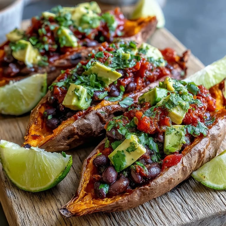- Once the sweet potatoes are tender, carefully slice each one open lengthwise and use a fork to fluff up the insides slightly. Spoon a generous amount of chipotle black beans into each potato, then top with a heaping spoonful of tomato salsa, allowing some of the fresh juices to drip down into the beans. Add avocado slices, extra cilantro, and a lime wedge if you're feeling fancy.